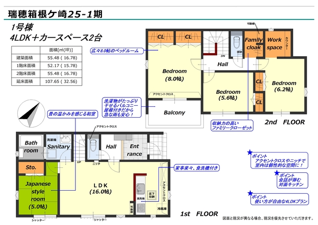 1階は広々とした16.0帖のLDKに5.0帖の和室ルーム。 2階はカウンター付のワークスペースやファミリークロークもあり用途別に使えるスペースも充実の間取りが魅力。